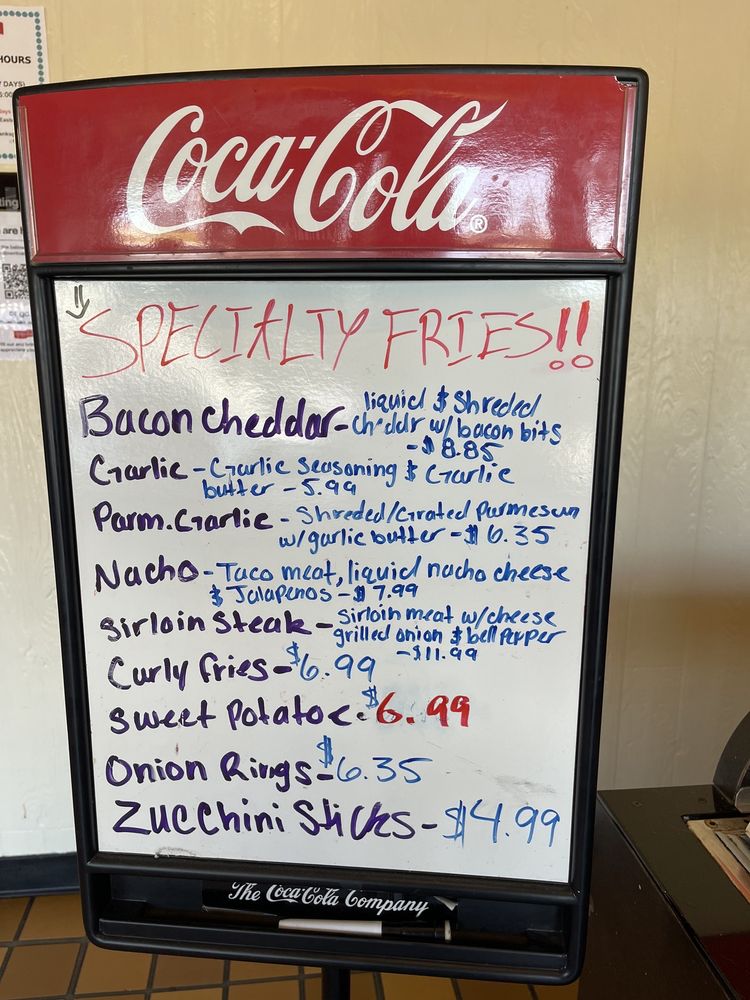 1/4 lb. burger, fresh 90% lean meat patty, never frozen, cheese, lettuce, tomato, pickle, onion, and Thousand Island for the sauce as needed.