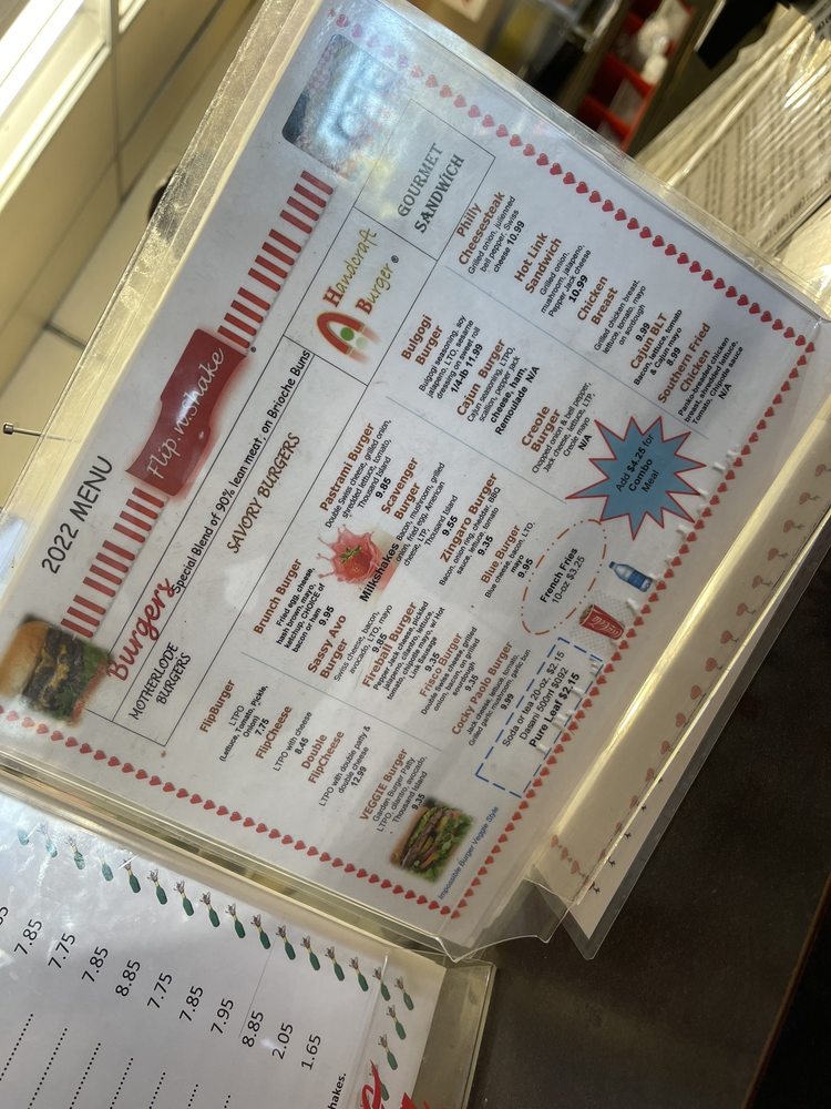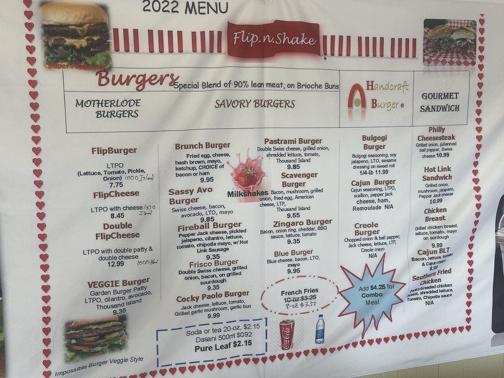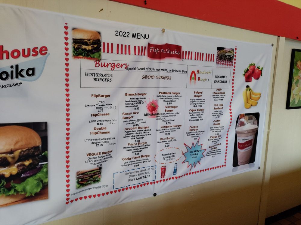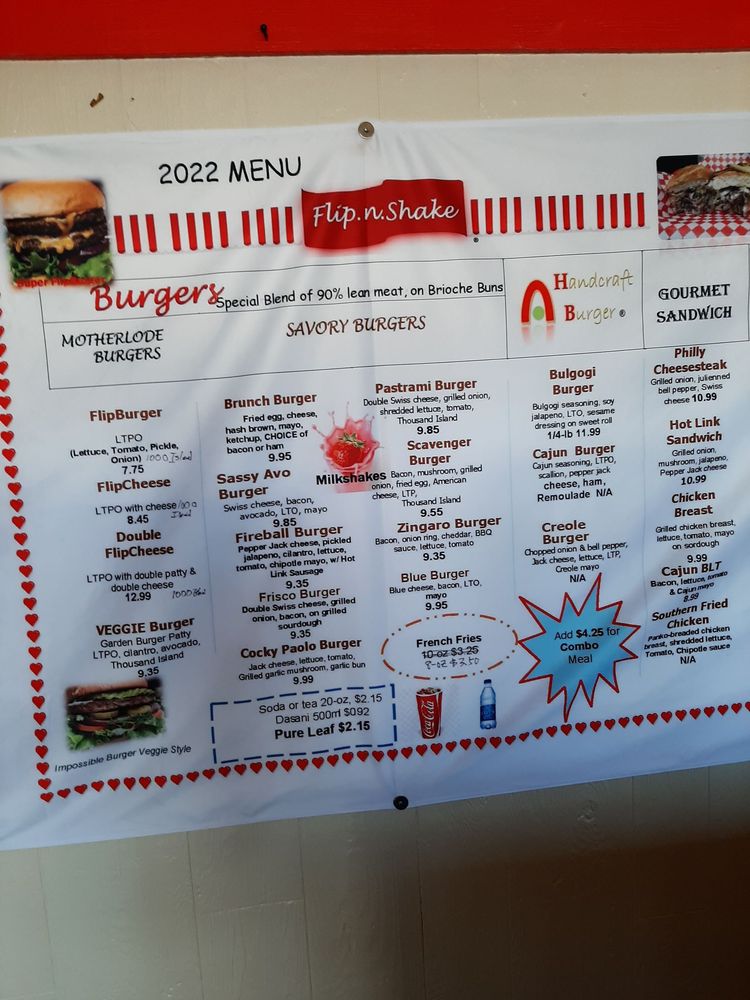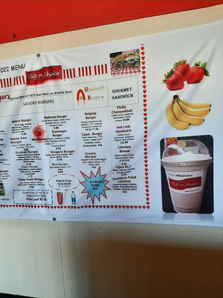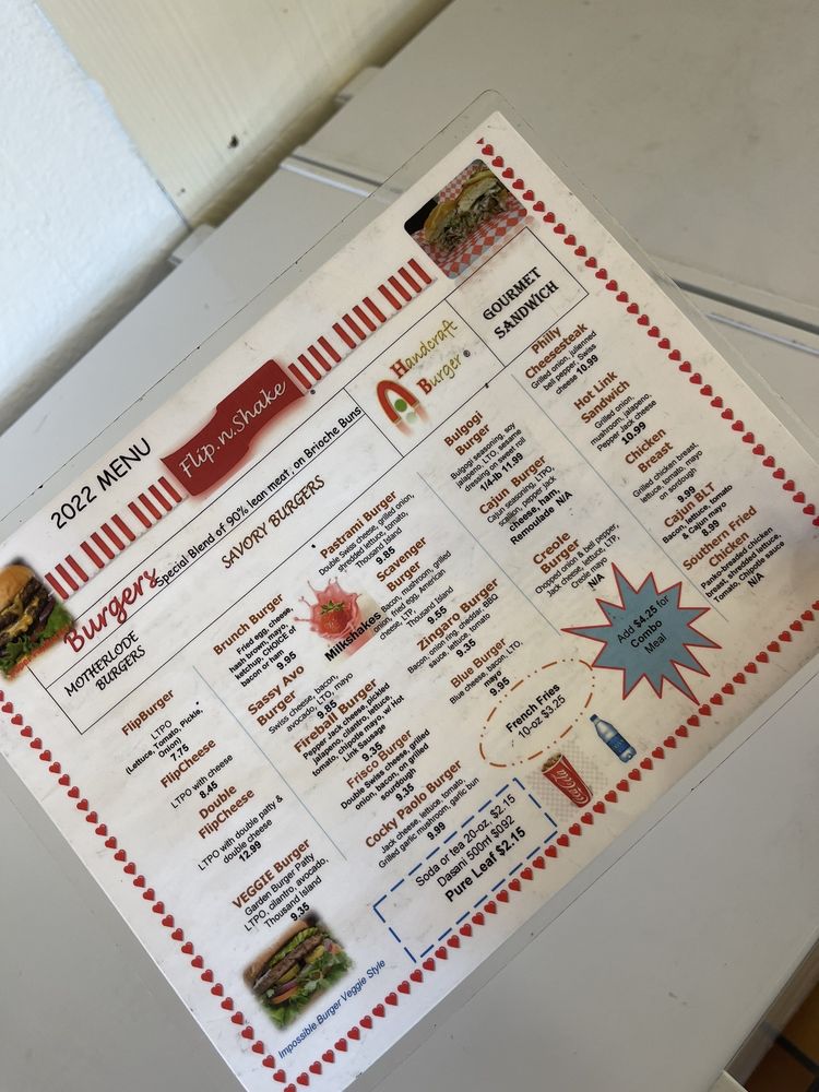"Introducing the menu at Flip.n.Shake, a casual yet vibrant burger joint located in Sacramento, CA. This restaurant offers a variety of options for all types of diners, including vegan and vegetarian choices. The menu boasts delicious burgers like the FlipCheese and unique offerings like the bulgogi burger. Customers rave about the quality of ingredients, friendly service, and nostalgic old-school flavors. Must-try items include the mint milkshake and the signature cheeseburger with a sunny side up egg. Flip.n.Shake also offers a diverse drink menu, gift cards with discounts, and a cozy atmosphere perfect for families and friends. With rave reviews and a loyal customer base, this mom-and-pop spot is a must-visit for those craving tasty burgers and shakes."
